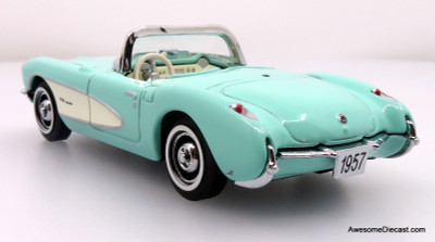 Eye-catching turquoise finish with white coves and chrome trim Diecast replica of the iconic 1957 Chevrolet Corvette convertible Classic body lines, rounded fe