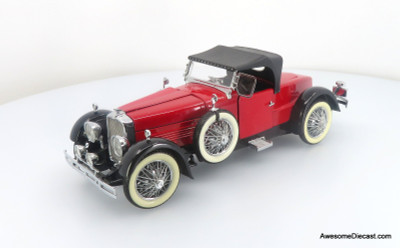 The 1928 Stutz Black Hawk Boattail Speedster epitomized luxury and speed during the Jazz Age, boasting dramatic lines and powerful engineering. This finely detailed 1:24 Franklin Mint replica captures its charisma in two-tone red and black with a sleek boattail rear and dual spare tires. Opening doors and hood expose a realistically rendered cabin and inline engine. From an estate collection, the model is in pristine condition aside from slight paint rash only visible under certain angles. Comes in original Styrofoam (box not included).