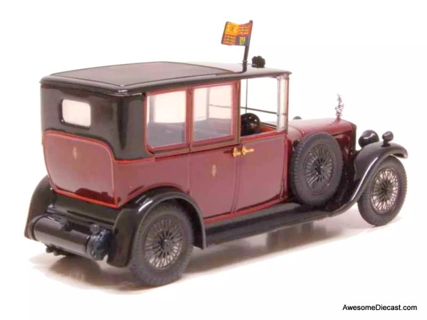 This Oxford Diecast 1:43 scale model of the 1929 Daimler "Sandringham" replicates the official state limousine of King George V, a vehicle known for its elegance, prestige, and royal legacy. The Daimler, finished in Burgundy and Black, features gold-plated door handles, wire-spoke wheels, and chrome accents, embodying the sophistication of the British monarchy. The roof-mounted royal standard flag and detailed front grille with a sculpted emblem add to its regal presence.