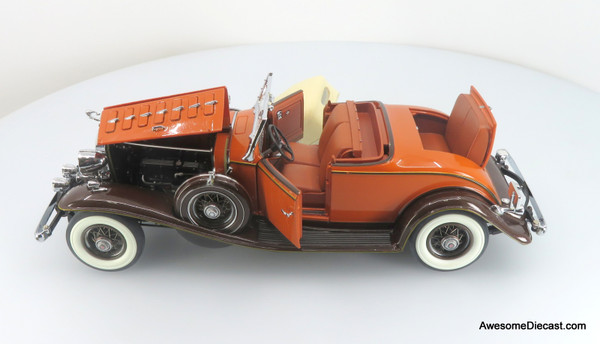 The 1932 Cadillac V16 Roadster represents the pinnacle of pre-war luxury motoring, combining unmatched craftsmanship with elite performance from its legendary 16-cylinder engine. This 1:24 scale model by Danbury Mint captures every curve and chrome accent in two-tone elegance, complete with a functioning rumble seat, dual spares, and intricate interior. From an estate collection, this limited edition collectible is in pristine condition and includes the original box—an exceptional find for classic Cadillac enthusiasts.