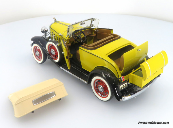 The 1932 Chevrolet Confederate Sport Roadster embodied the transitional elegance of early 1930s American automotive design. This 1:24 scale replica by Franklin Mint showcases a vivid yellow finish with black fenders, whitewall tires, and red spoked wheels for visual impact. Features include a removable soft top, opening parts, a fully detailed interior, and a rear-mounted trunk with luggage detail. In excellent estate-kept condition, with only faint paint rash under certain lighting. Ships in original Styrofoam (box not included).