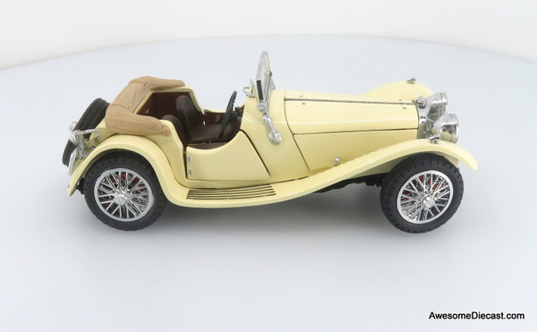 The 1938 Jaguar SS-100 is a pre-war British roadster renowned for its sweeping fenders, exposed headlights, and commanding road presence. This 1:24 scale Franklin Mint replica showcases the model’s elegant lines with a cream finish, detailed chrome grille, wire wheels, and a rich interior with analog gauges. The hood, doors, and trunk open to reveal impressive craftsmanship throughout. Sourced from an estate collection, this model is housed in its original Styrofoam but lacks outer packaging and shows slight paint rash under bright light.