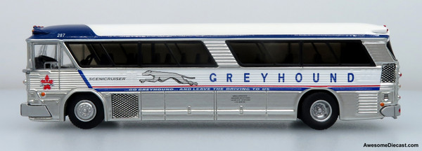 Iconic Replicas brings this piece of transit history to collectors in precision 1:87 scale. The model features a fully diecast body, fine pad-printed details, rubber tires, and a detailed interior. The paint scheme faithfully replicates the silver-and-blue Greyhound livery with red accents and the famed running greyhound logo. Only 504 units were produced, making this an essential addition for bus collectors and Canadian transportation enthusiasts alike.