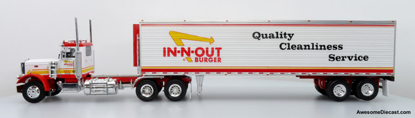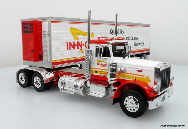 This 1:43 scale diecast model by Iconic Replicas captures the classic 1973 Peterbilt 359 truck paired with a refrigerated trailer in the iconic livery of In-N-Out Burger. The model showcases detailed pad-printed graphics featuring the brand’s well-known red, white, and yellow theme, complete with “Quality, Cleanliness, Service” messaging on the trailer side.