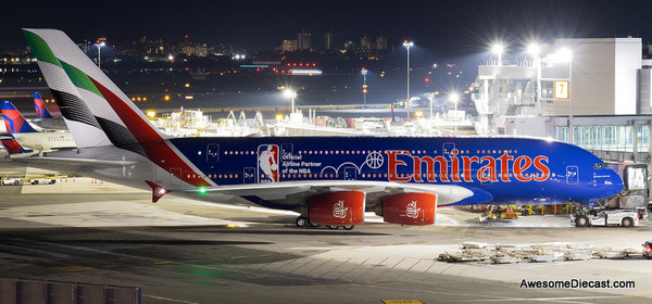 The Emirates-NBA A380 livery was a full repaint, as part of an elaborate project encompassing design, painting, production and installation to bring the customized aircraft to life. The process, fully executed in-house by the Emirates Engineering Aircraft Appearance Centre teams, took 19 days to execute, inclusive of stripping, painting and graphics application processes.