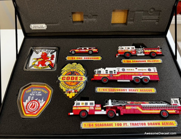 The replicas featured are Engine 233, Rescue 2, Ladder 175 and Battalion 44. Also included are replica patches from Engine Co. 233 and the FDNY. These individual replicas are exclusive to this set and will not be available anywhere else!