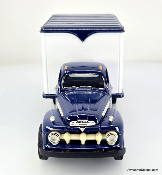 The 1952 Ford F-6 Dry Goods Van is an iconic representation of mid-century delivery vehicles, known for their durability and distinctive design. This First Gear diecast model in 1:34 scale captures the essence of the original, showcasing a striking blue and white finish with detailed craftsmanship that highlights the classic Eagle Snacks branding.