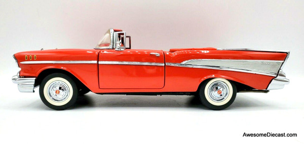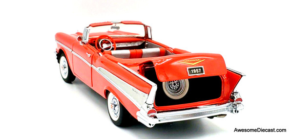 Gloss red body with contrasting white roof and full-length chrome trim Authentic ’57 Bel Air badging and detailed grille and fins