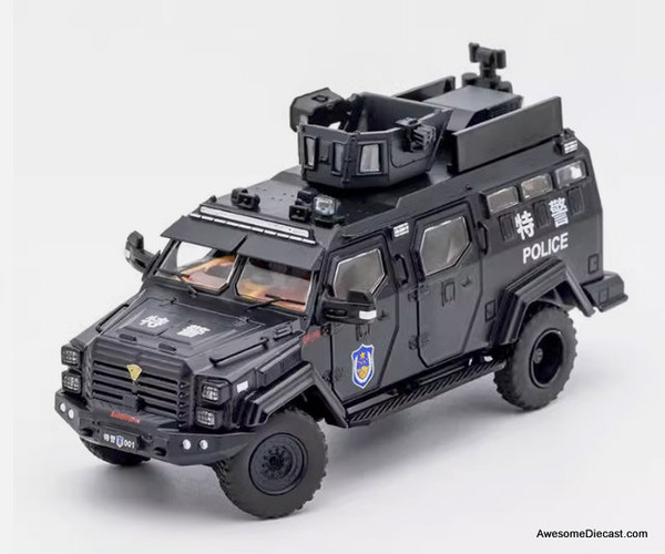 It is 6.7 meters long, 2.36 meters wide, 3 meters high, and has a full load of 6.8 tons. It uses a V10 engine with very high power. Adopt rear twin tire design, high-speed four-wheel drive, suitable for various road conditions. The car has a maximum speed of 130 kilometers per hour, automatic transmission, and the vehicle is equipped with search lights, tear gas cannons, lifting lights, sonic diffusers, electric winches and other devices, all-round infrared camera system, and the car can accommodate 10 special people The soldiers can shoot at the moving target at any angle in a short time. It is a non-lethal anti-riot weapon used for anti-riot and anti-terrorism.