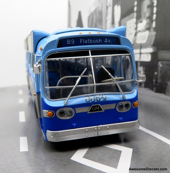 - Etched-metal interior stanchions, stamped-metal handrails and separate farebox and steering wheel parts installed.