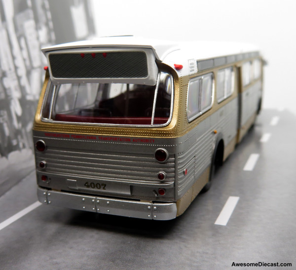 • Etched-metal interior stanchions, stamped-metal handrails and separate farebox and steering wheel parts installed.