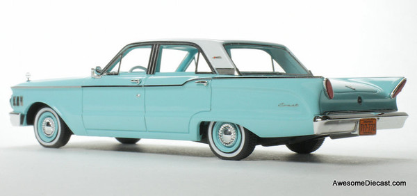 Introduced in March 1960, initial body styles were 2-door and 4-door sedansand 2- and 4-door station wagons. Two trim levels were available, standard and "Custom", with the custom package including badging, additional chrome trim and all-vinyl interiors. In 1960, the only engine available was the 144 cidThriftpower straight six with a single-barrel Holley carburetor which produced 90 hp (67 kW) at 4200 rpm. (Some sources list it as producing 85 hp (63 kW) at 4200 rpm). Transmission options were a column-shifted 3-speed manual and a 2-speed Merc-O-Matic automatic transmission (unique to the Comet, despite sharing a name with the Merc-O-Matic installed in other Mercurys).
