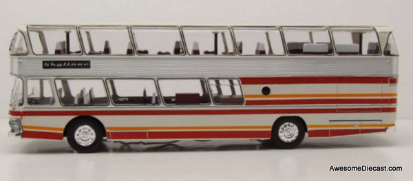 The double-deck Skyliner concept was taken to its ultimate conclusion in 1975, with the introduction of the Jumbocruiser, a double-deck articulated coach 18 metres (59 ft 1 in) long and 4 metres (13 ft 1 in) high. The Spaceliner, introduced in 1979 took the Cityliner concept of passenger floor level above the driver, and extended the actual floor above the cab. This kept the height of the vehicle lower than a double-decker, at 3.65 metres (12 ft 0 in), but still allowed installation of toilets, kitchens or sleep cabins below the passenger compartment