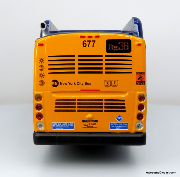 This 1:43 scale NFI Xcelsior XN40 Transit Bus replica captures the energy and vibrance of New York City’s public transit system. Decorated in the iconic blue and yellow livery with the bold “I ♥ NY” slogan, this model represents MTA’s Select Bus Service (Bx36 to Washington Heights / George Washington Bridge). It celebrates the real-life buses seen across the five boroughs serving one of the busiest commuter routes in the city.