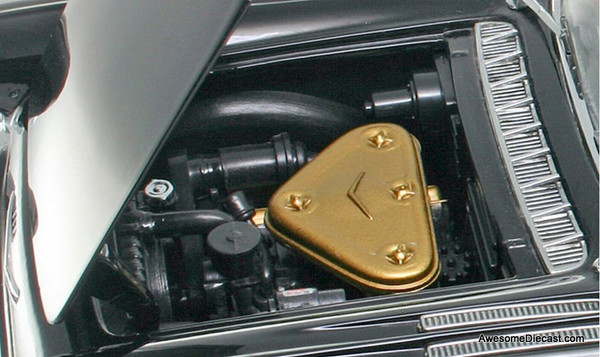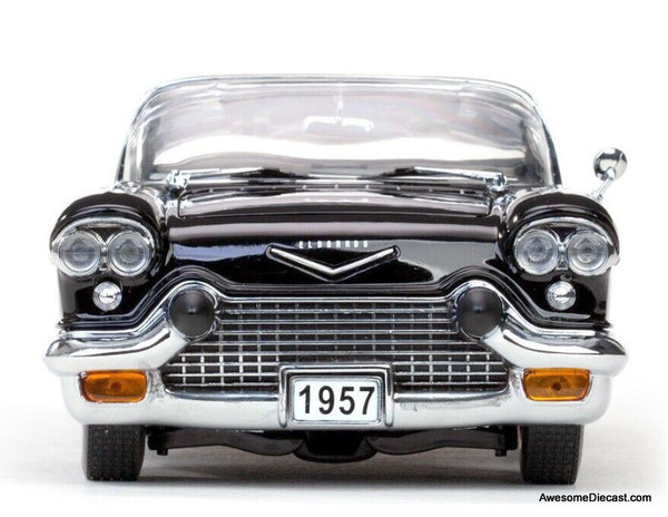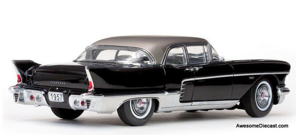 1957 saw the Eldorado (in both Biarritz convertible and Seville hardtop body styles) receive new styling with an exclusive rear-end design featuring a low, downswept fenderline capped by pointed in-board fins. Just behind the open rear wheel housings the lower rear quarters were trimmed with broad, sculptured stainless steel beauty panels that visually blended into the split rear wraparound bumper assemblies. A form of this unique rear-end treatment first appeared (sans fins) on the Cadillac "Interceptor" prototype from the immediate post-war era. Series 62 Eldorados (as distinct from the Series 70 Eldorado Brougham) were further distinguished by the model name above a V-shaped rear deck ornament and on the front fenders. The three section front bumper was shared with the rest of the redesigned Cadillac model line, as in previous years the Eldorados came with a long list of standard features. Four specially-built 4-door hardtop Eldorado Sevilles were also built in 1957.