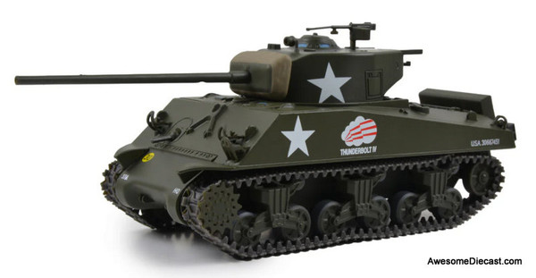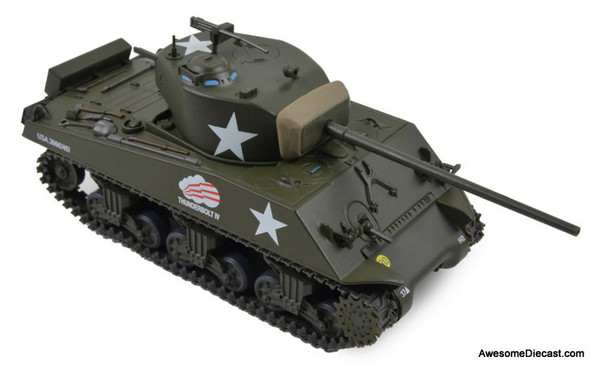 This particular 1:43 scale replica of an US M4A3 Sherman medium tank was commanded by Creighton Abrams and nicknamed "Thunderbolt", which was attached to the 37th Tank Battalion, 4th Armored Division, then deployed to Bastogne during December 1944.
