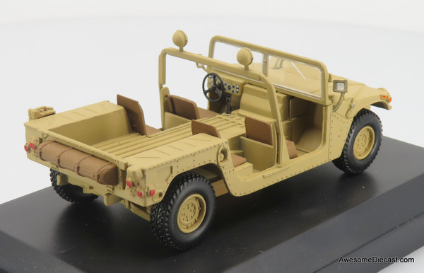 Description: This 1:43 scale diecast US Army Hummer by Vitesse Victoria pays tribute to the iconic military vehicle used during Operation Desert Storm. Finished in authentic desert tan, the model captures the utilitarian design that became a symbol of American mobility in the Gulf War. The open-top layout reveals a highly detailed interior, including brown molded seats, dashboard instrumentation, and roll bars.